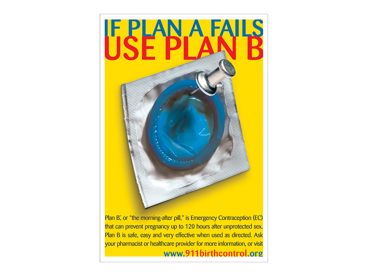 Playing off the name of the contraceptive drug, my headline is reinforced with a jarring image that imagines a very faulty Plan A. If the image didn't draw attention, the bold palette of primary colors did.